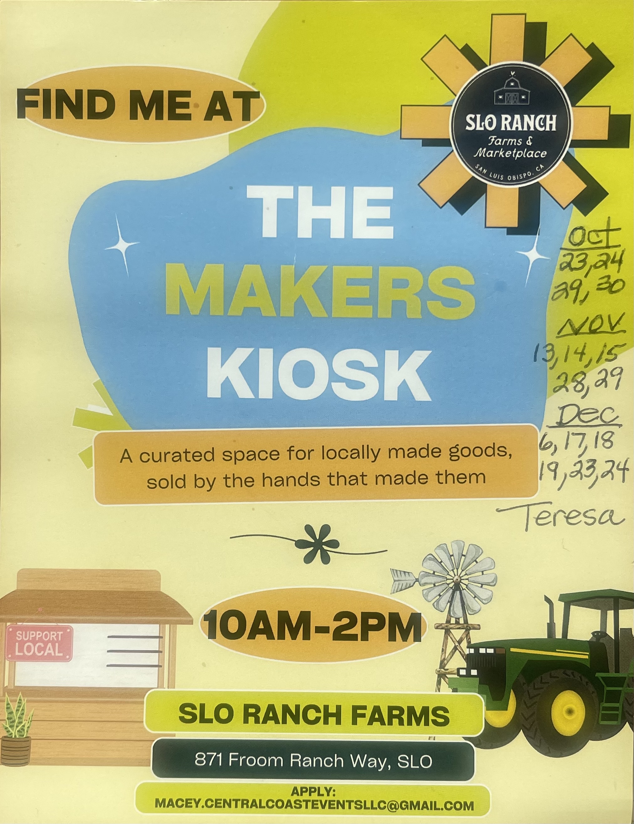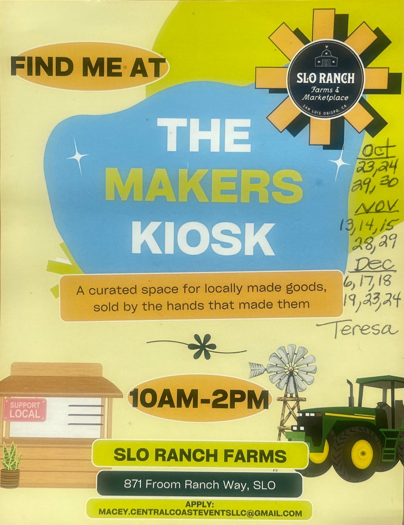 Her dates at SLO Ranch Farms are November 13, 14, 15, 28, 29 and December 6, 17, 18, 19, 23, 24 between 10AM and 2PM.