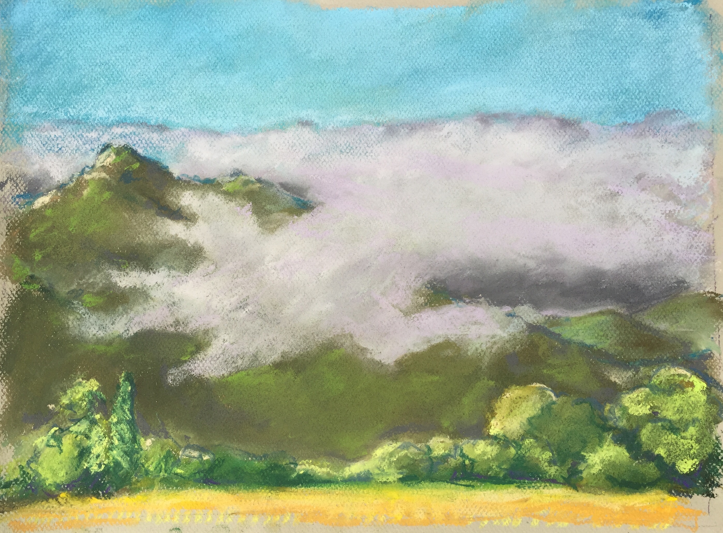 My pastels include a series of seascapes including marine layers, kite festival, rough winter waves and offshore views from Montaña de Oro CA State Park and landscapes of the Nine Sisters in springtime and gnarly trees of the California Central Coast.