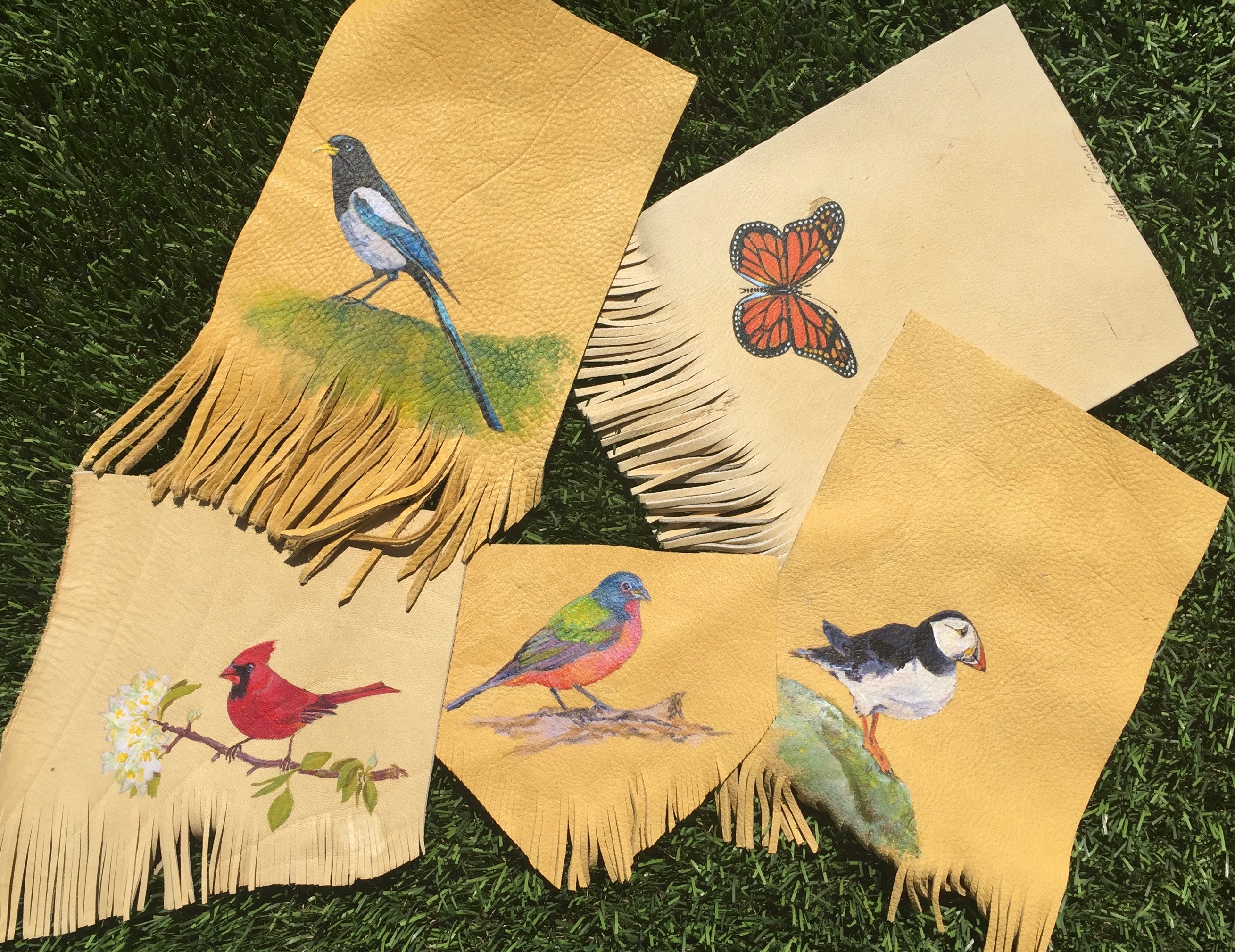 Birds and a Monarch butterfly on elk hide
