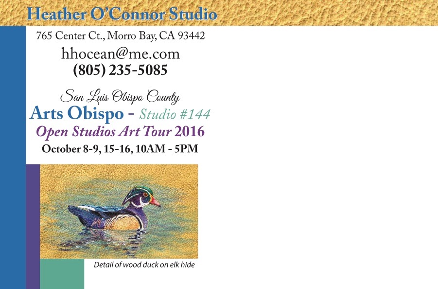 My acrylic bird paintings on elk hide will include 2 Common Loons, one with a chick on her back, a Painted Bunting, a Canyon Wren, and a Harlequin Duck. Others may be custom ordered and will benefit the Pacific Coast Peregrine Watch. 25% will go to a CalPoly Biology Scholarship.