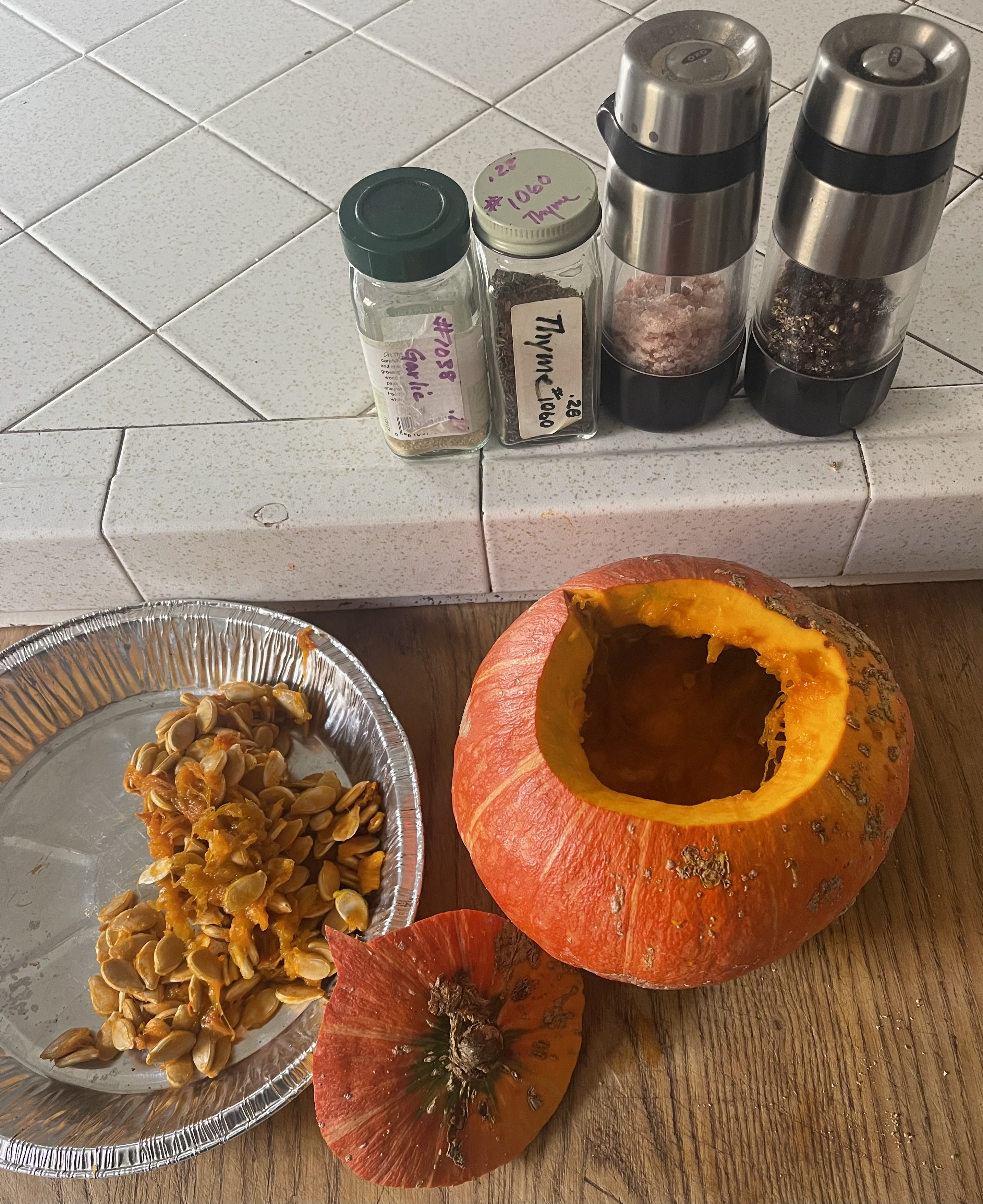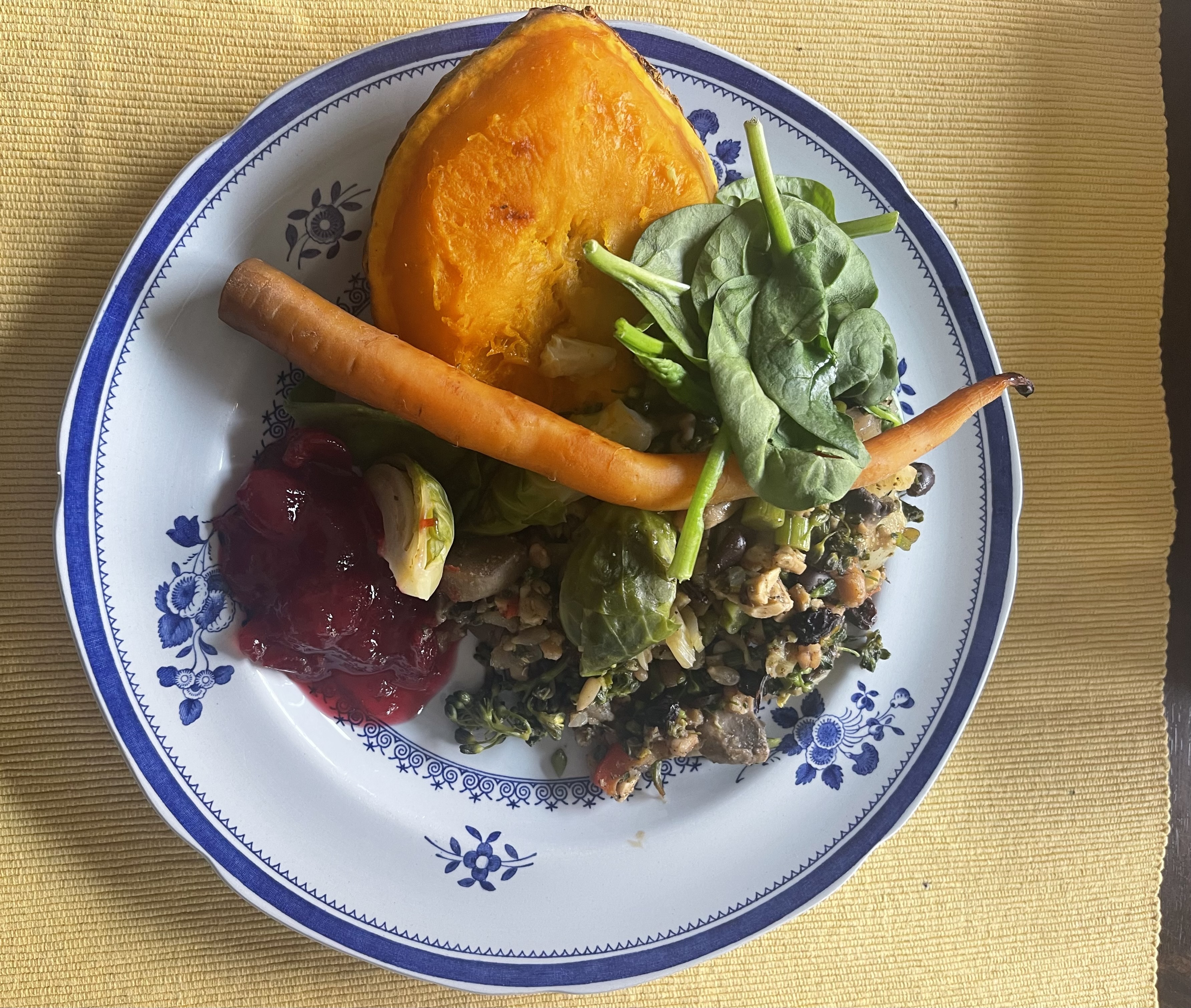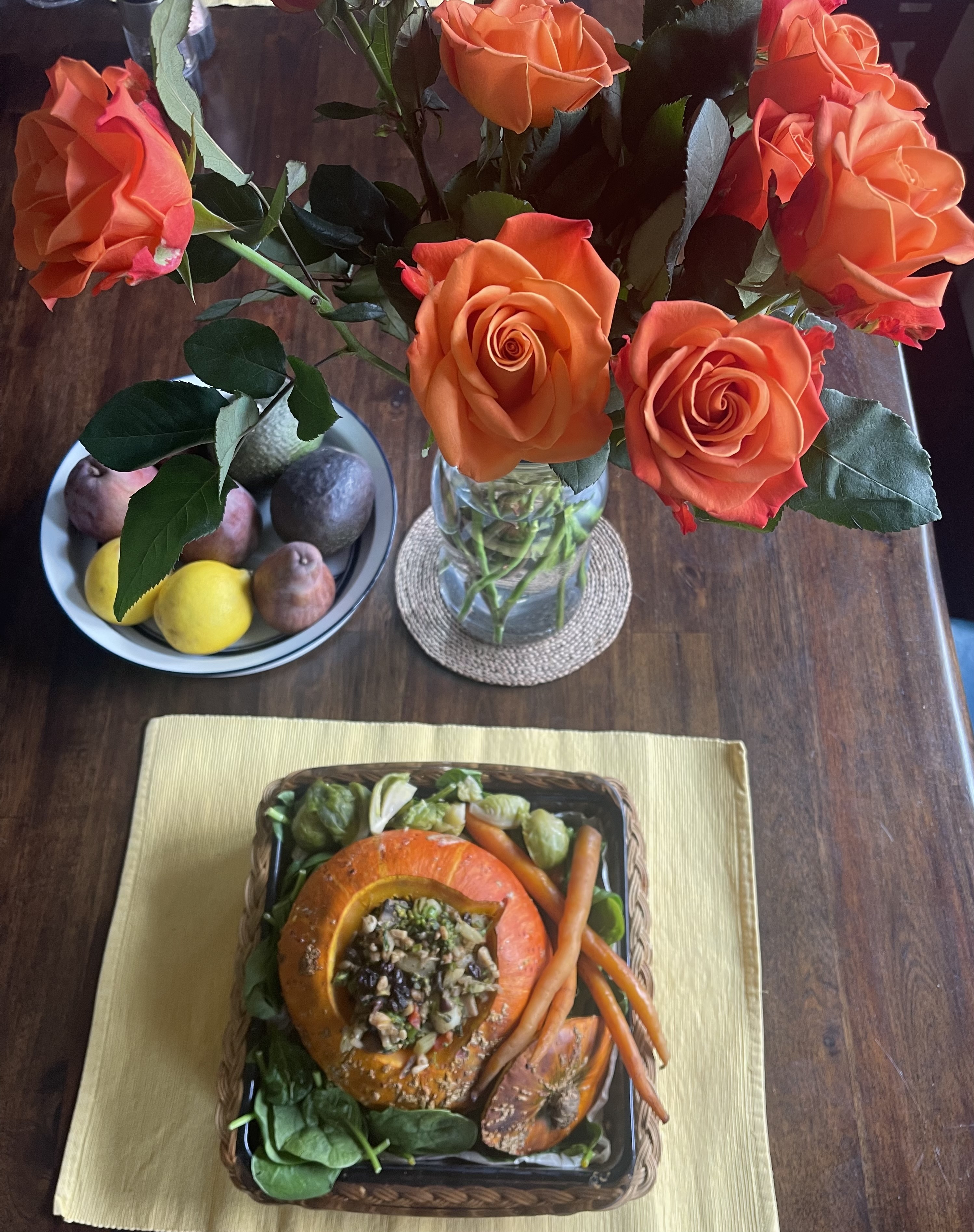 It is autumn in November. Sunny and warm on the California Central Coast in Morro Bay. It’s time for a special focus on a plant-based celebration. Here are the beginnings of my Thanksgiving Day dinner that I have assembled. A kabocha squash bought at the Baywood Farmers’ Market along with herbs and poultry seasonings was the centerpiece. More would be added as the assembly continued.