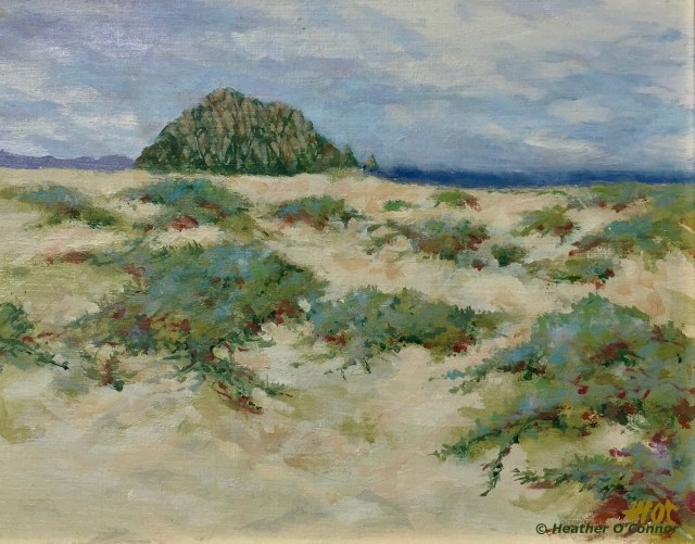 This summer, showing my paintings in the Morro Bay Art Association was great success… It was a show of the favorite places that visitors to our town love to see… “Morro Rock.” I’ve sketched and painted it numerous times. We all love the “rock” in all its personalities. The one below is a bright day with a bit of the marine layer in the distance. It often creeps in gradually…