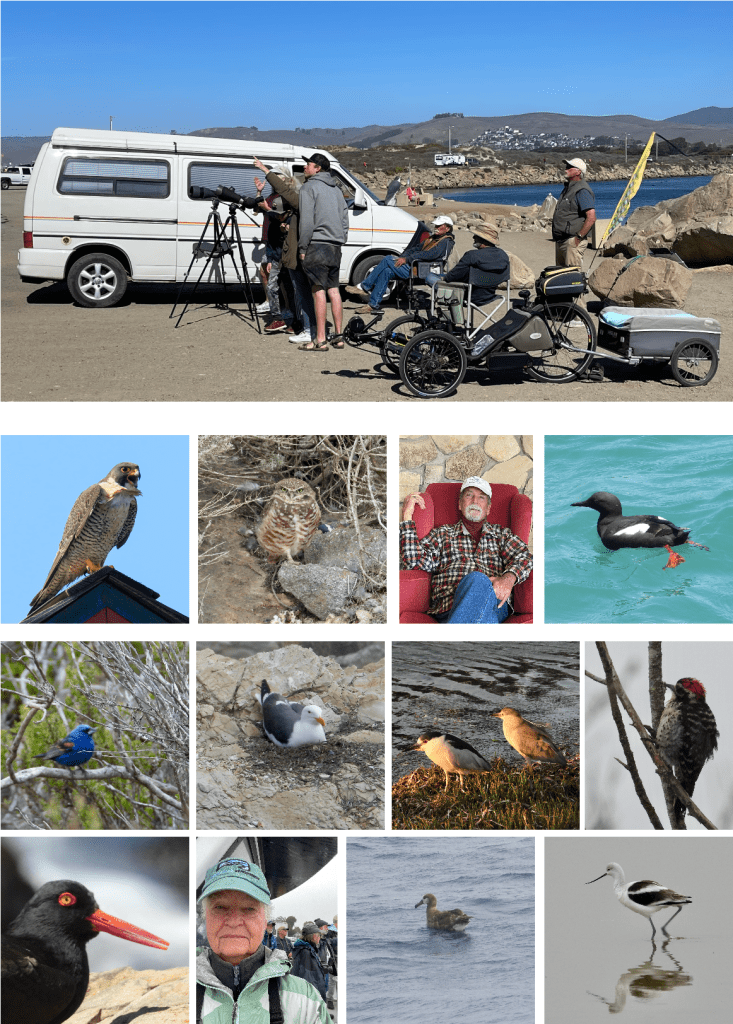 We had a very busy birding year with Bob going daily to Morro Rock showing hundreds of visitors the Peregrine Falcons, a Burrowing Owl and many other birds. Heather went out eBirding keeping Checklists for Cornell most days and is up to 277 species in the San Luis Obispo County so far. I also went on a Pelagic Trip. Photos from top left down: Peregrine Falcon, Burrowing Owl, Bob, Pigeon Guillemot, Blue Grosbeak, Western Gull, Black-crowned Night Heron, Nuptials’s Woodpecker, Black Oystercatcher, Heather, Black-footed Albatross, American Avocet.